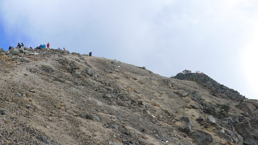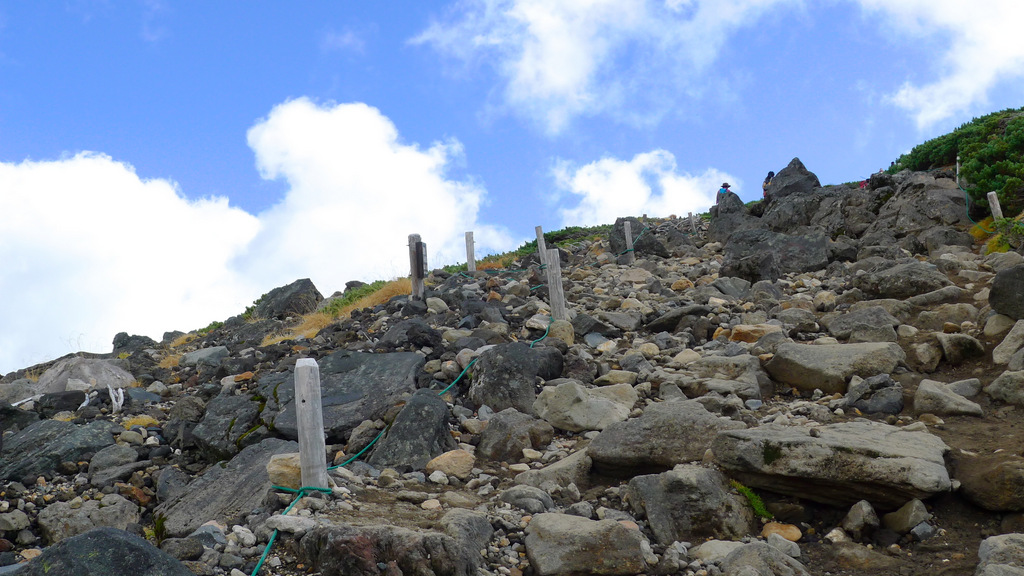肩の小屋から剣ヶ峰へは、こんなガレ場が続いて、ガツンと足にきますねー