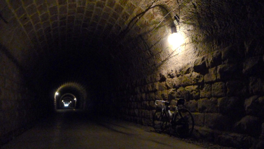 苔むした石積みの中は雫がぼたぼた落ちて、前方には出口が遠く小さく見ます。