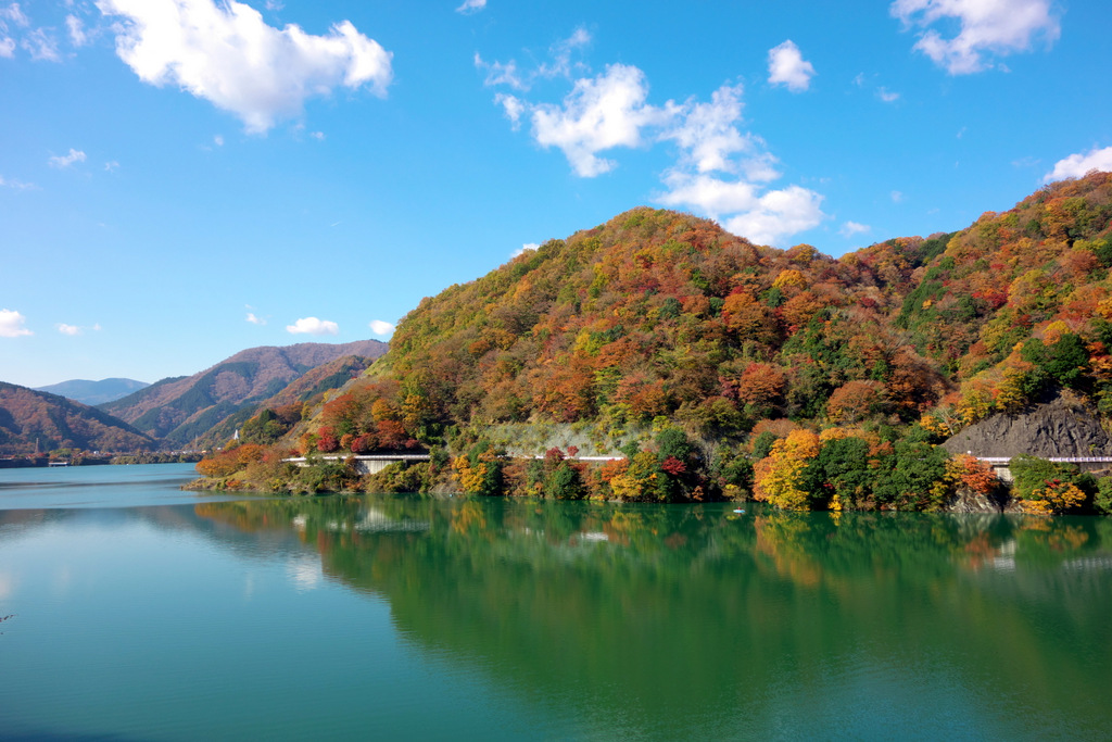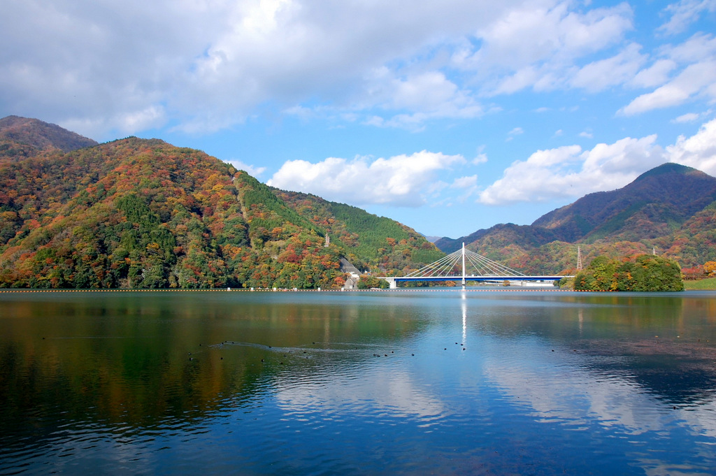 神奈川の景勝50選に選定されている丹沢湖、緑と紅葉が静かな湖面に映える美しい湖です。