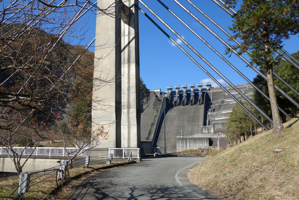 ロックフィルダムの三保ダム、コンクリートの荒々しさが対照的で、とても美しいダムだね。