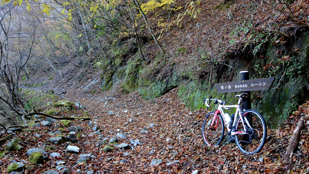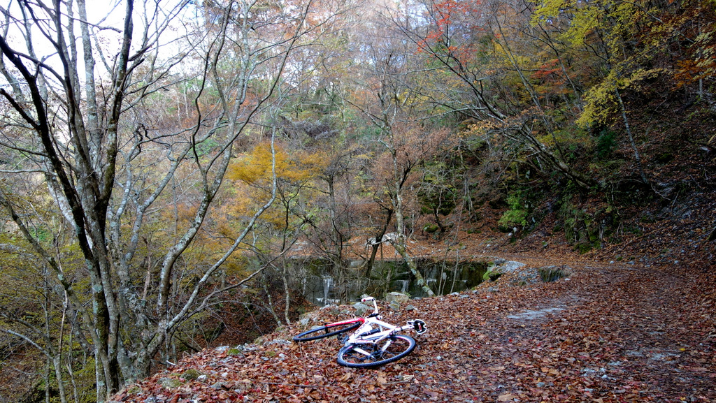ユーシンロッジの分岐から先は、尖った石もなく比較的平らな路面で、落葉で覆われていて走りやすいです。