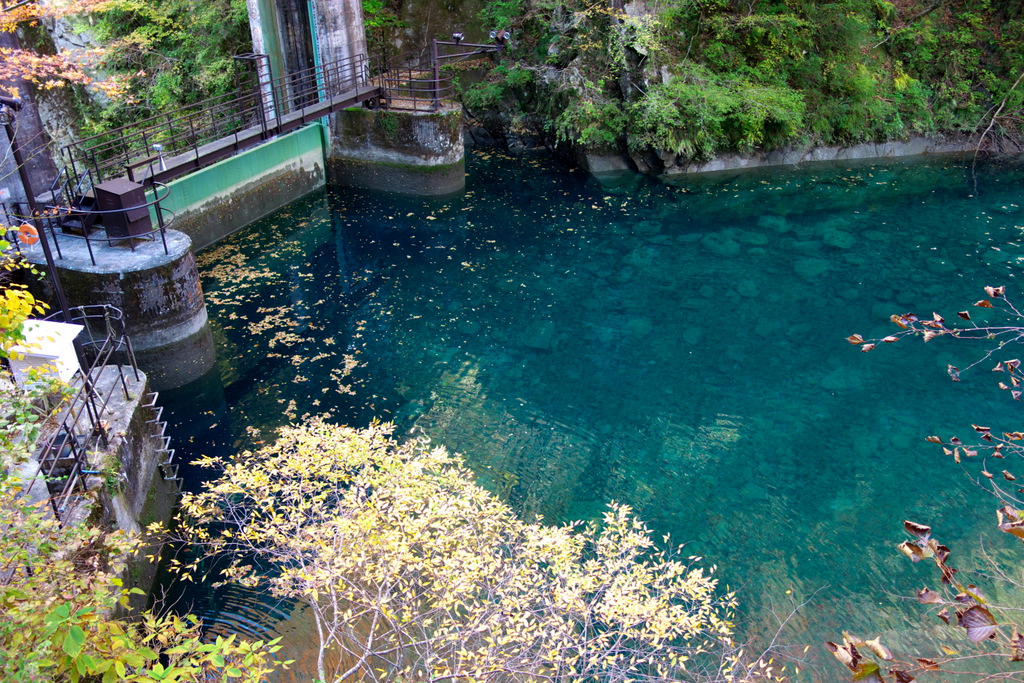 玄倉第二発電所。小さな調水池は、底が透き通って見えるほどの清らかな水が、周りの紅葉を映してエメラルドグリーンに輝いています。
