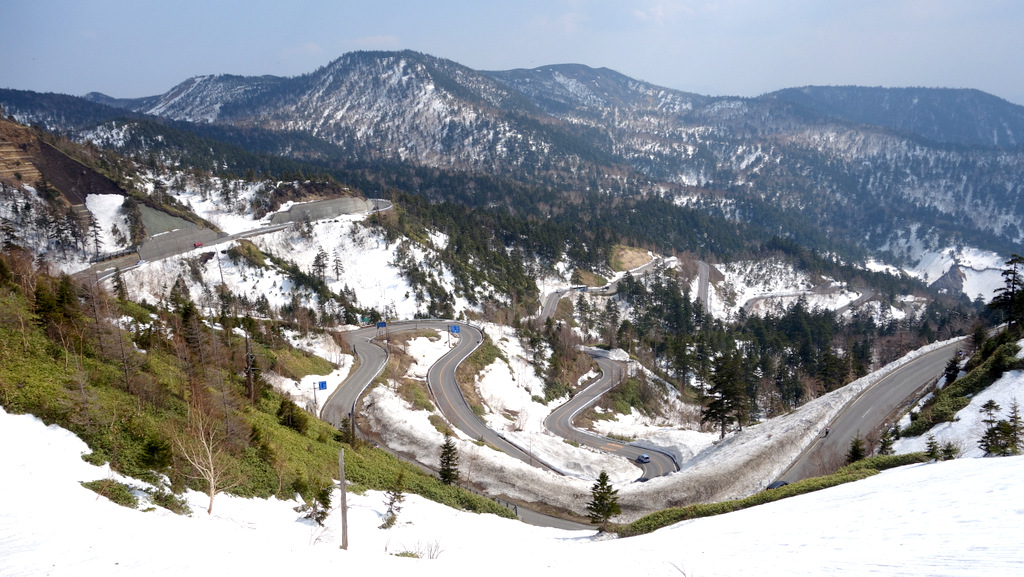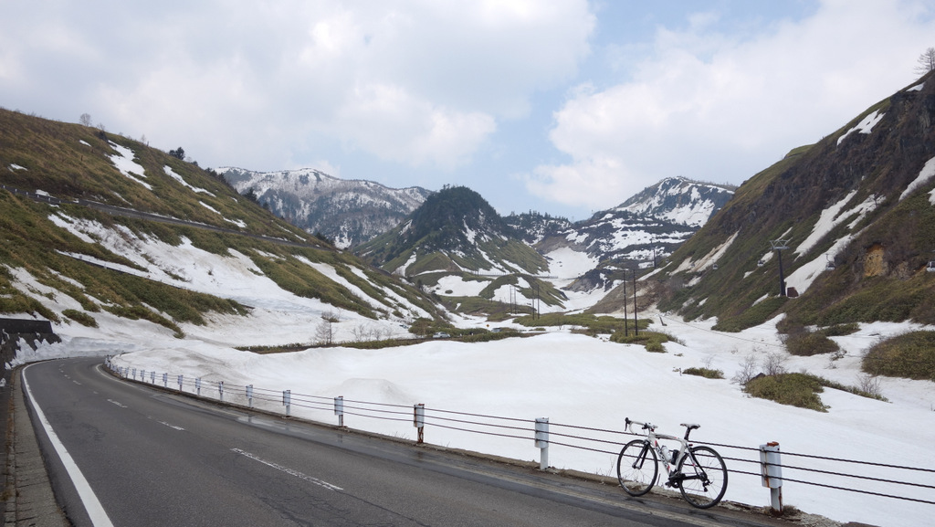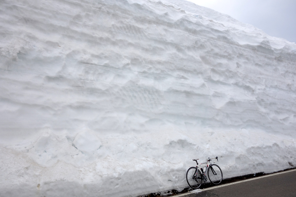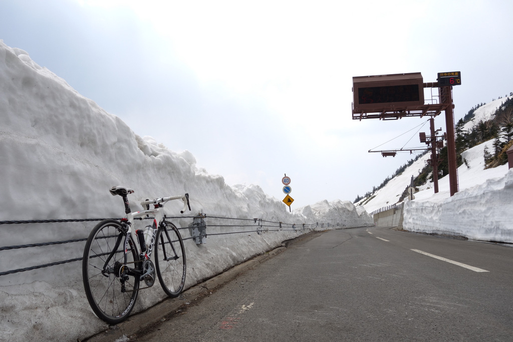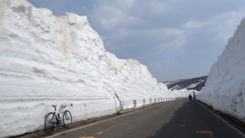 両側を高い雪の壁に挟まれた中を走れるのは、山岳道路ならではのもの。