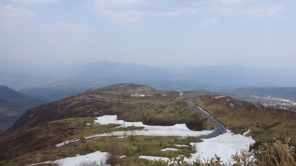 眼下には芳ヶ平の湿原を見下ろし、山肌伝いにうねうねと続く道の先には草津温泉の町が広がります。