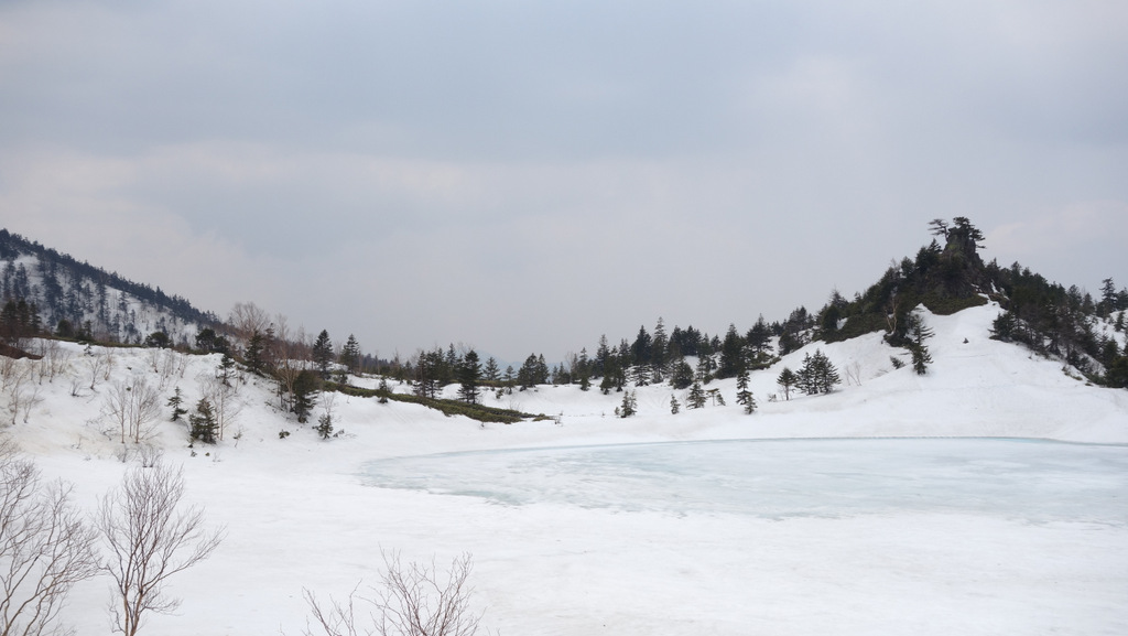 源頼朝に追われた木曽義仲の残党が、武具を脱ぎ捨てたという伝説がある「武具脱の池」のあたりに来ると、視界が開けてきて残雪がチラホラと・・・
