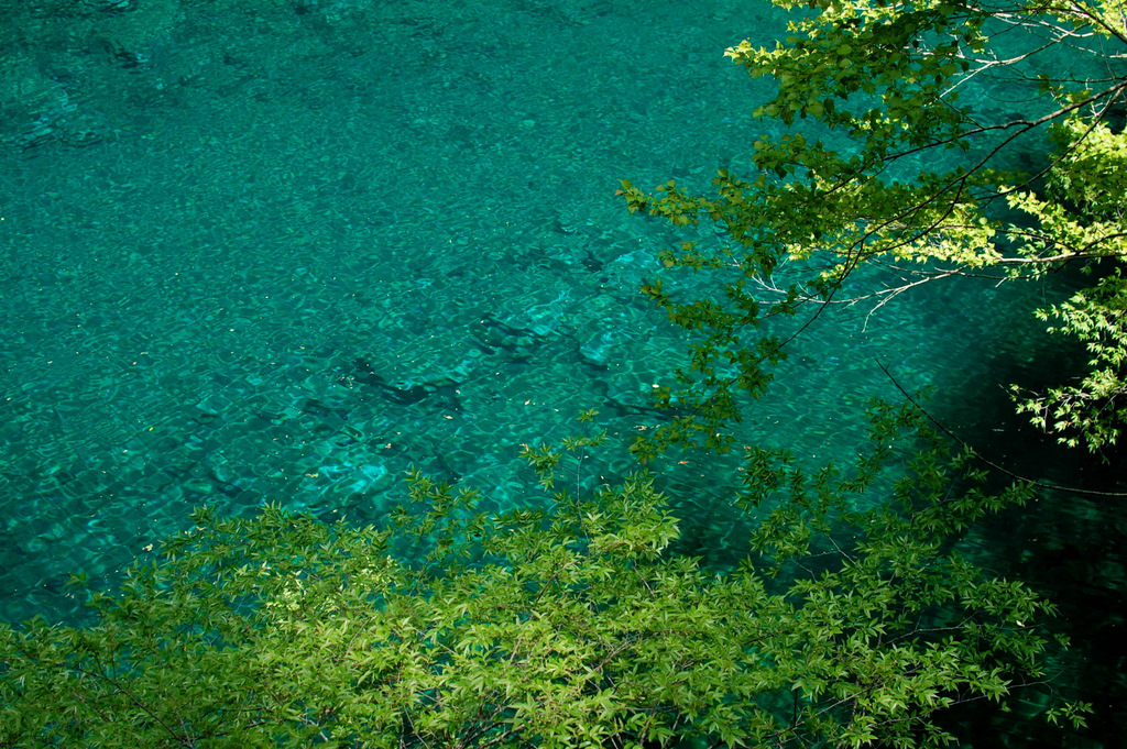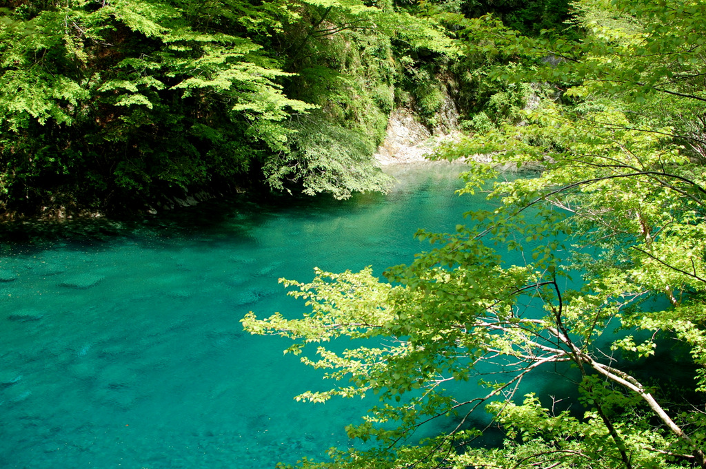 川面のエメラルドグリーンと新緑のコントラストが綺麗~