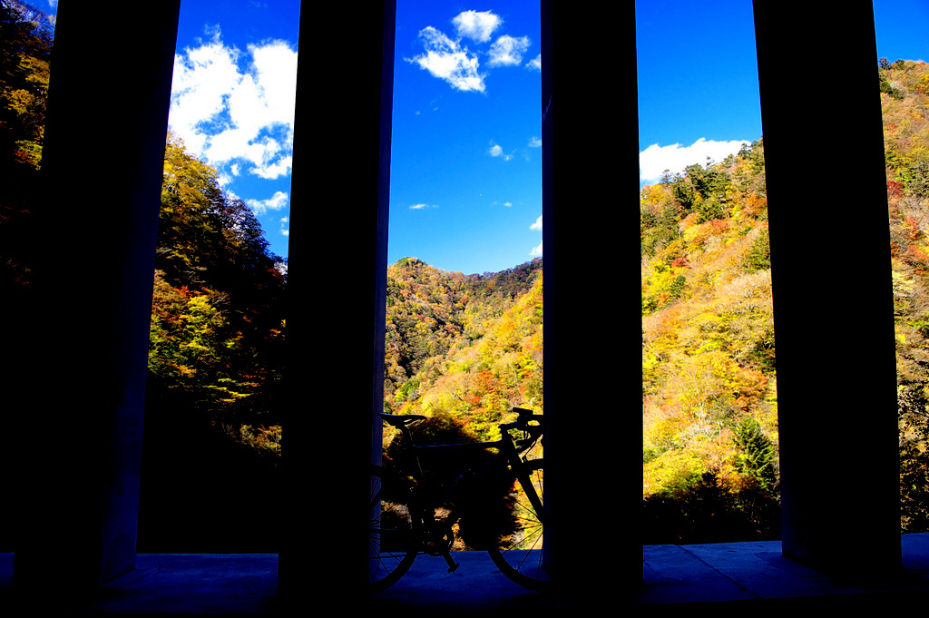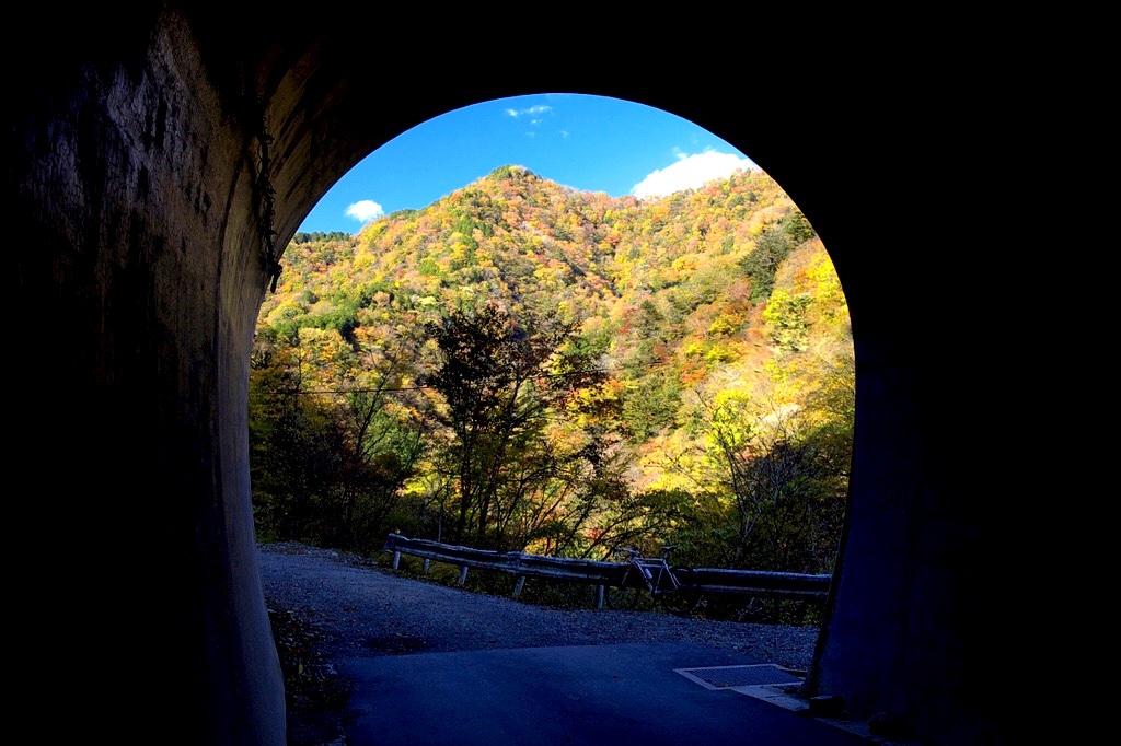 青崩橋を過ぎていくと新青崩隧道があり、このトンネルを過ぎたところにある洞門の柱の間からは、玄倉川の流れと紅葉した山々のユーシン渓谷の景観が望めます。