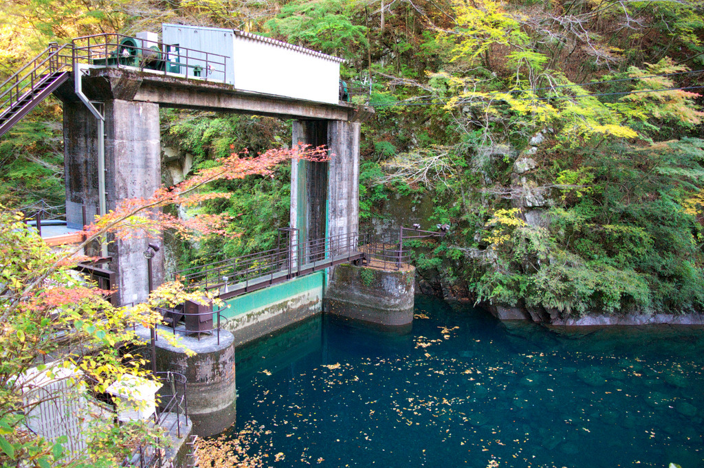 発電所へ至る橋の上から、紅葉の山々とエメラルドグリーンの川面を眺めるのもいいものです。