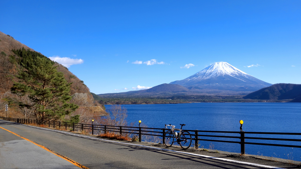 本栖湖湖畔沿いの道を富士山と湖を眺望しながら快走!