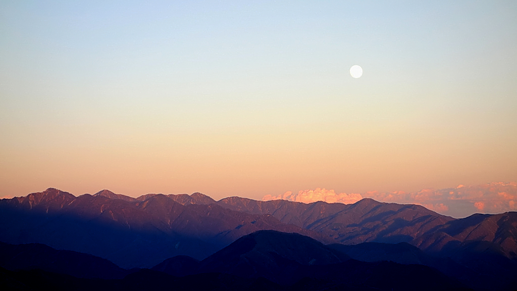 ■三国峠から見る夕陽があたる丹沢山系と満月