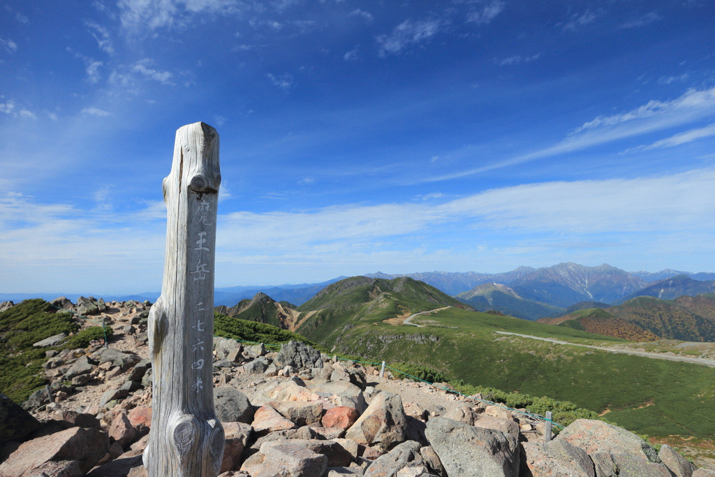 うろこ雲の秋空のもと、穂高連峰をはじめとする北アルプスと稜線を走る乗鞍スカイラインが一望!