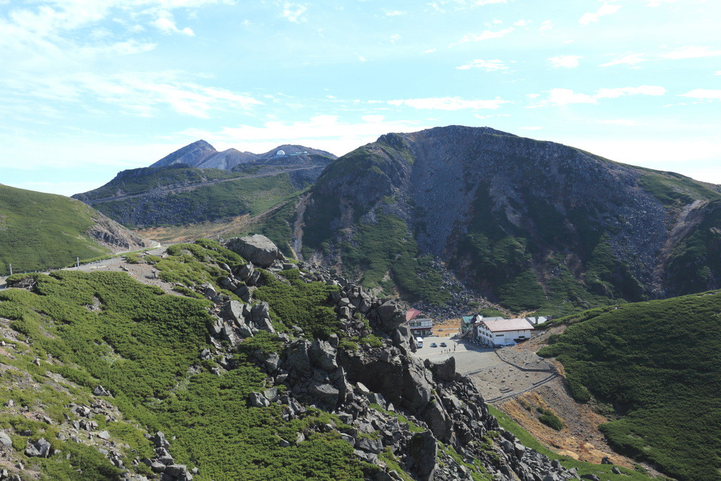 魔王岳から振り返ると、剣ヶ峰をはじめとする乗鞍岳の山々、眼下には畳平のバスターミナルが見渡せる。