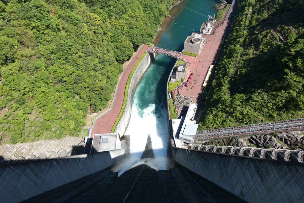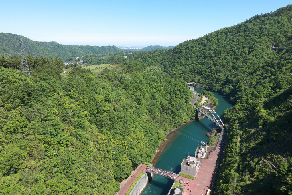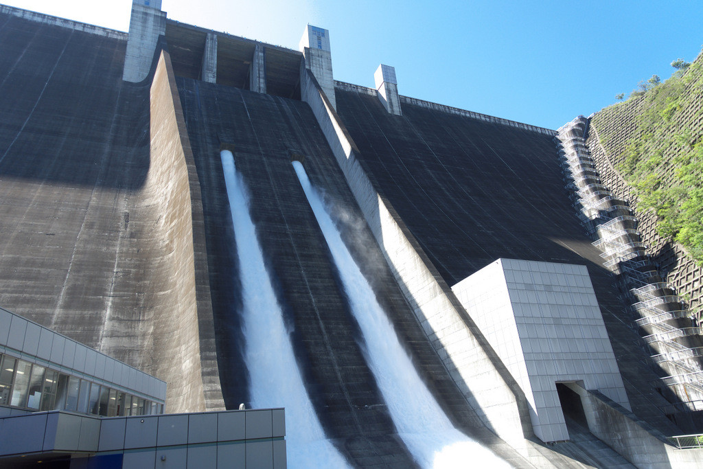 今日は観光放流が実施される日。全国的にも例が少ない観光放流は、毎秒30m3の水を放流するもので、高低差70mの人工の滝が出現し、水が織り成す壮大なショーを楽しむことができます!