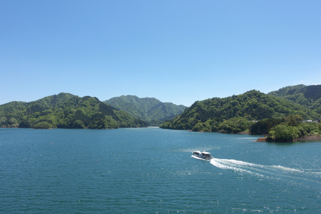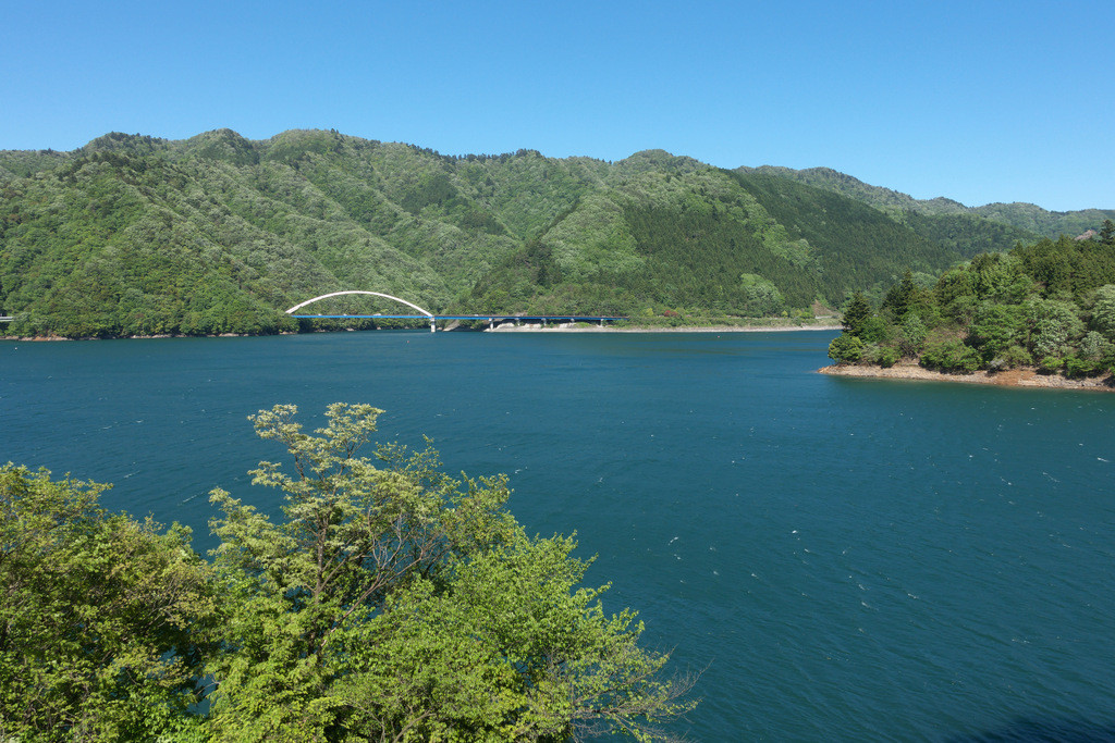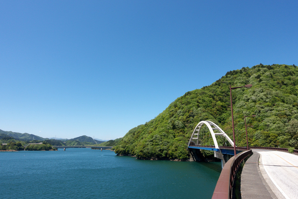 やまびこ大橋から見るコバルトブルーのダム湖と緑の山々、そして真っ青な空! 気持ちいい~