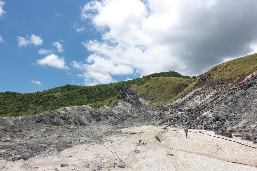 殺生河原のゴツゴツした岩肌との対峙、月面クレーターのような無数の噴気孔から蒸気が噴出する。