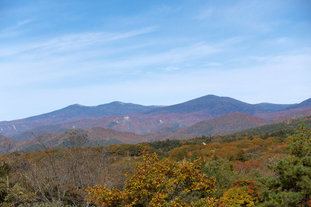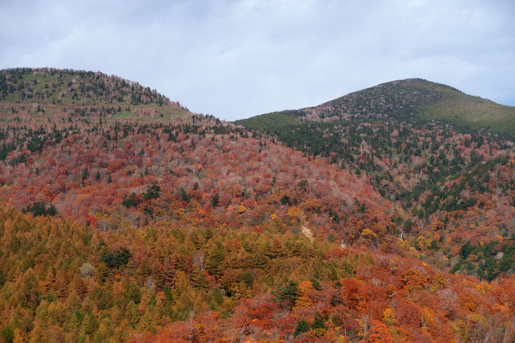 母成峠から吾妻山方向を望む。標高が上がるにしたがって、紅葉が薄れているのがグラデーションから見てとれますね。