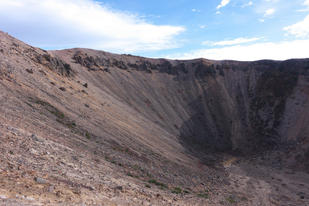 浄土平の駐車場から130メートルほどの標高差を登れば、火口の淵に立ち、1.5kmほどの火口を一周することができます。(火口の直径は500m程)