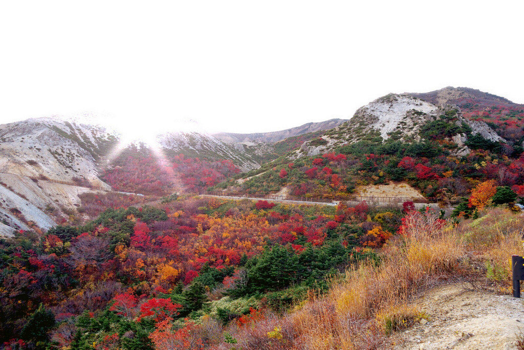 磐梯熱海温泉から徐々に勾配が上がってきて、標高800mあたりから道路沿いの木々も色付いてきました。