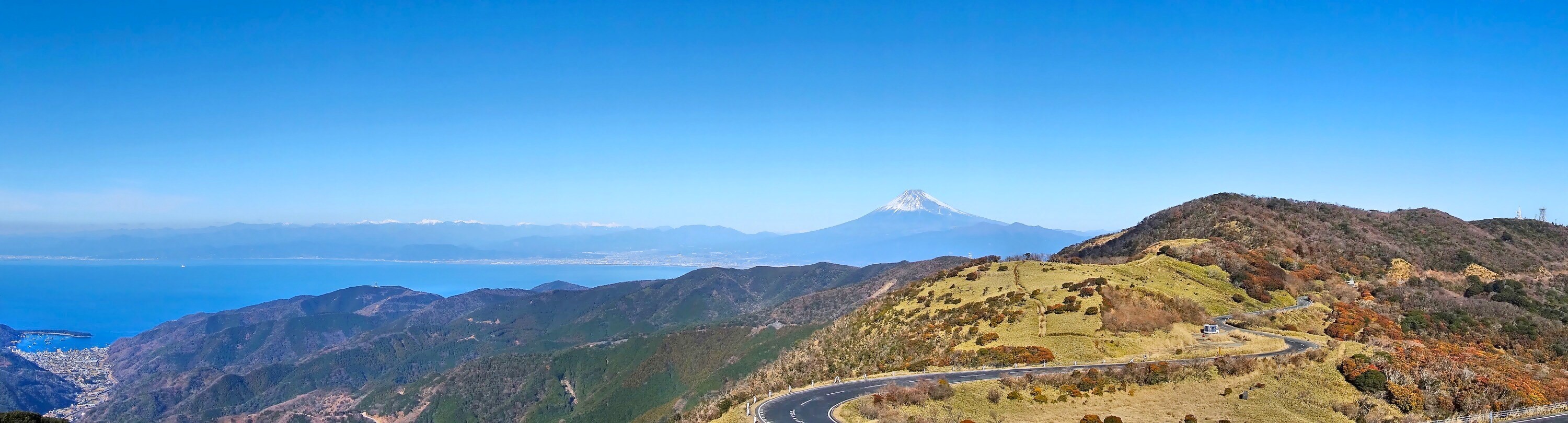 ちょっと霞んでいたけれど、青い空と海、そして、冠雪した富士山と南アルプスの絶景!