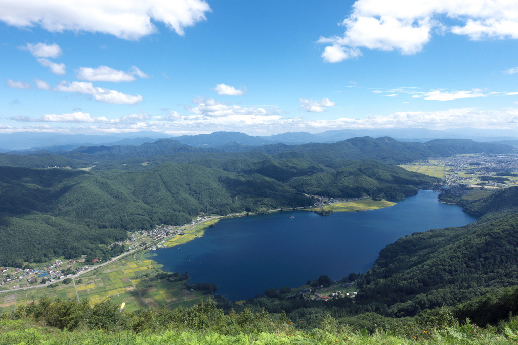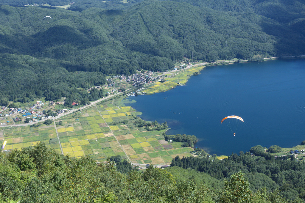 木崎湖をバックに、パラグライダーが気持ちよさそうです。