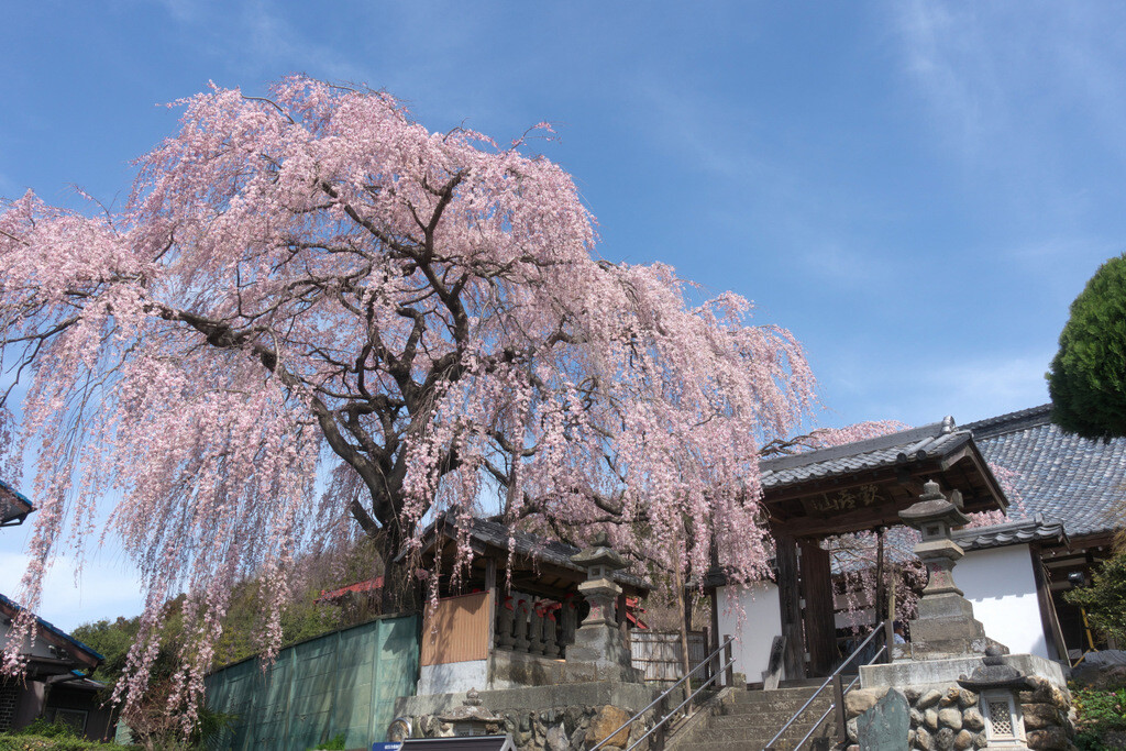 樹齢80年ほどで、境内から山門前の石段に紅色の桜花が降り注ぐさまは艶美です。